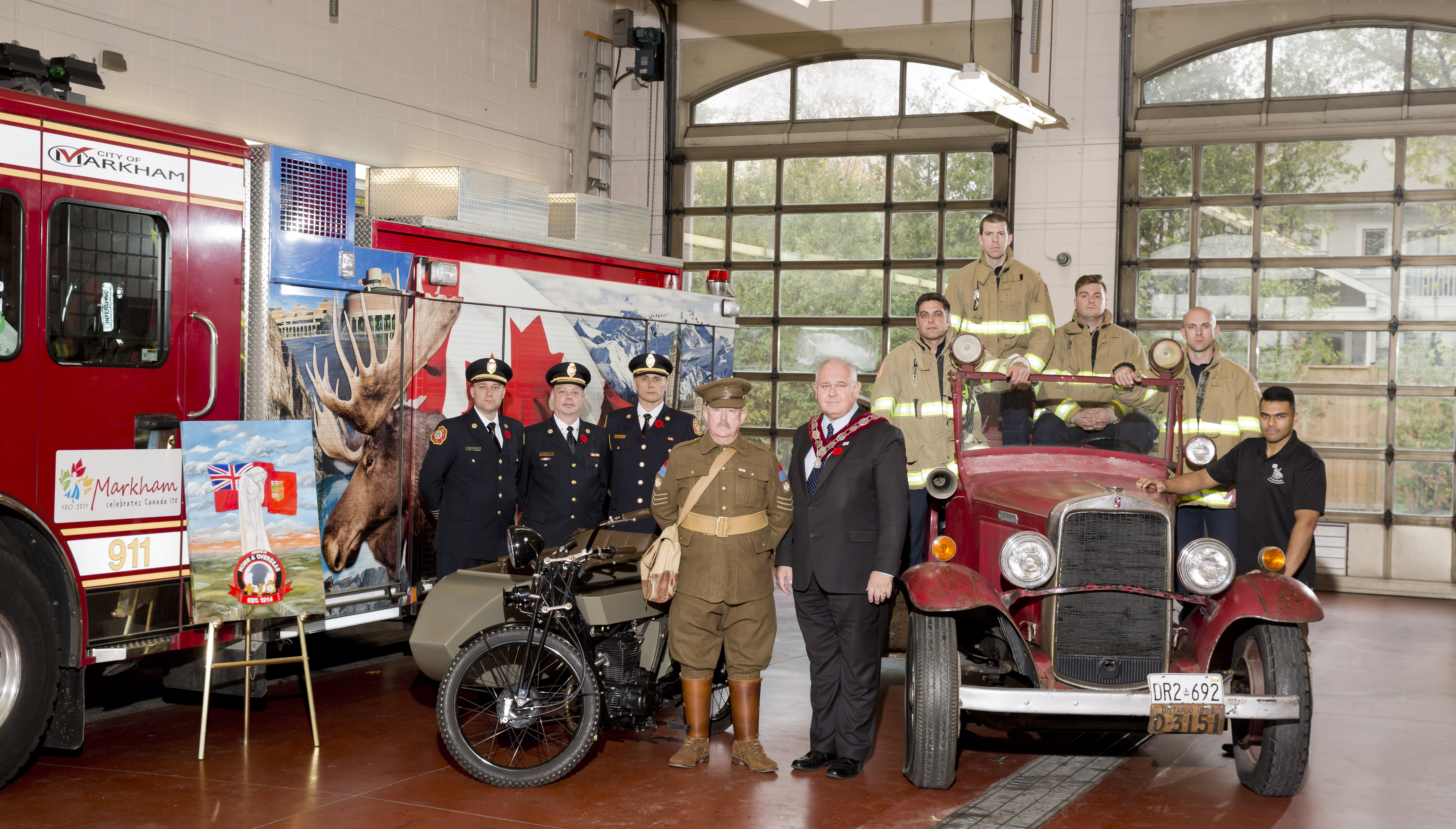 Markham Fire & Emergency Services joins RA Bob McTaggart, 4th Canadian Mounted Rifles Association and Markham Mayor Frank Scarpitti to commemorate Red Fridays in the City of Markham.
