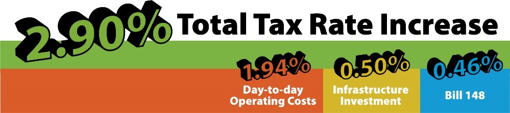 The approved 2018 tax rate increase of 2.90 per cent includes: 1.94 per cent for day-to-day operating costs, and 0.50 per cent infrastructure investment to ensure there are sufficient funds set aside in the life cycle reserve for the next 25 years. The remaining 0.46 per cent was approved to address the new provincial legislation Bill 148, Fair Workplaces, Better Jobs Act, 2017.