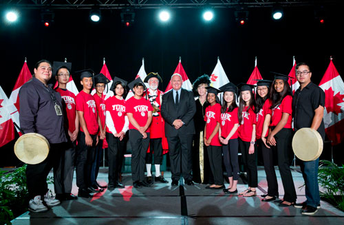 First Nations drum performers, York University students from the class of 2025, Markham Town Crier John Webster, Mayor Frank Scarpitti and other special guests at the closing ceremony.